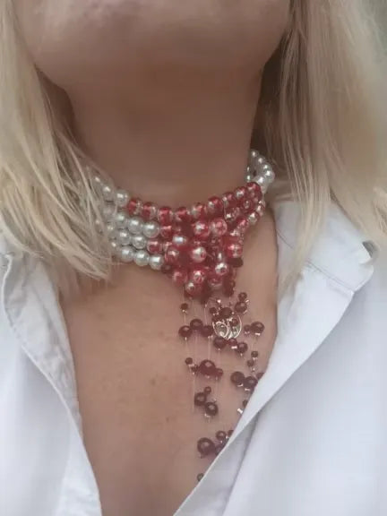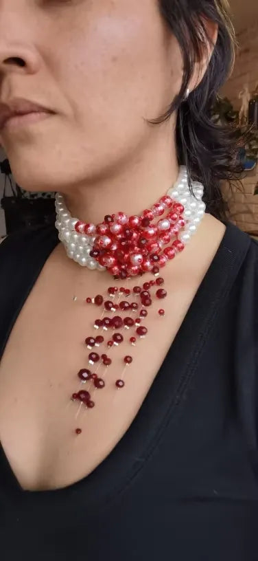 El collar presenta perlas de imitación y una cadena de metal de alta calidad con un patrón de sangre roja gótica para un look único y estiloso.
