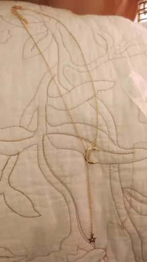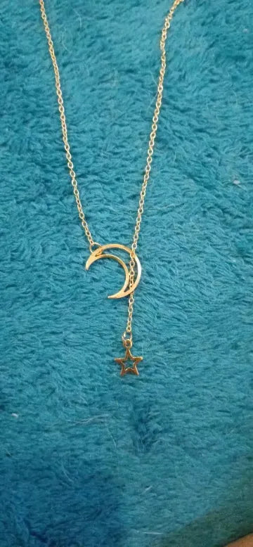 "¡OMG! ¡Este collar es mi nuevo favorito! ¡Perfecto para fiestas o casual! ¡El diseño de luna y estrella es taaan lindo y creativo! ¡Me encanta cómo eleva cualquier atuendo sin esfuerzo y recibe muchos cumplidos!!!💫 -Susan R."